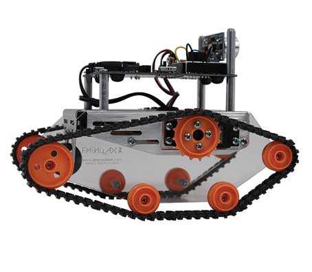 Turn your Parallax robot into mini-tank with the Tank Tread add-on kit! Custom-made clear acrylic side panels mount to your robot's aluminum chassis, and hold sets of small rollers for the rubber treads. A toothed gear replaces your robot's usual wheels, to drive the treads.